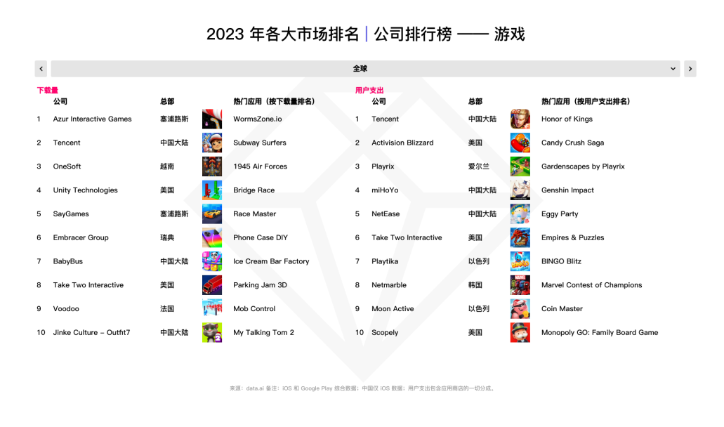 2023 年全球手游用户支出为 1073 亿美元,较去年同比下降 2%。由于全球经济环境的不稳定因素,人们用于游戏的可支配收入受到影响,这意味着游戏公司在运营过程中须保持足够的前瞻性和可持续性,以赢得有限的用户支出。当然,我们依旧能够看到不少游戏公司屹立不倒,长期保持着稳定的营收,而一些新的名字也成功跻身排行前列。dataai 将为读者盘点 2023 年全球移动游戏发行商排名,帮助您了解行业标杆,并从中探究当下手游市场热门趋势。